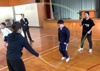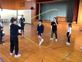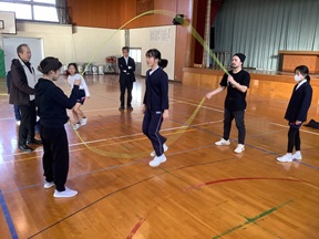 毎週火、木曜日に行っている放課後の体育活動にダブルダッチを取り入れました。講師に屋比久さんを迎え小学校3年生から6年生が初めて挑戦します。みんなでリズムを合わせて少しずつレヘルアップをめざして取り組んでいます。今回で3回目となりますが、回を重ねるごとにとてもうまくなってきています。これからの活動がとても楽しみです。